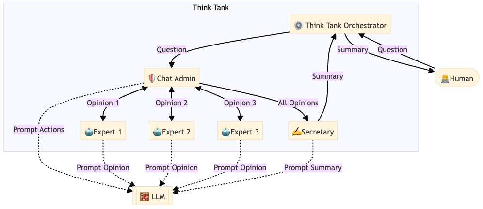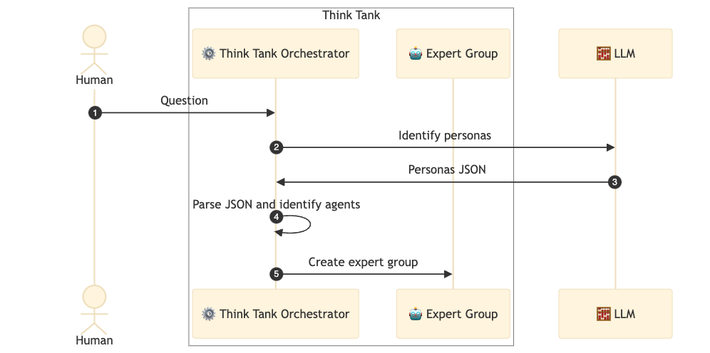 I toyed with various concepts, but "Think Tank" is a generic enough concept that captures the fact that there is a group of diverse experts without being bound to a specific domain or posing a limit on the number of experts involved. As you will see in the following sections, this framework can be applied to any domain and used to solve generic problems or as a "sub-team" of a larger, virtual organization.